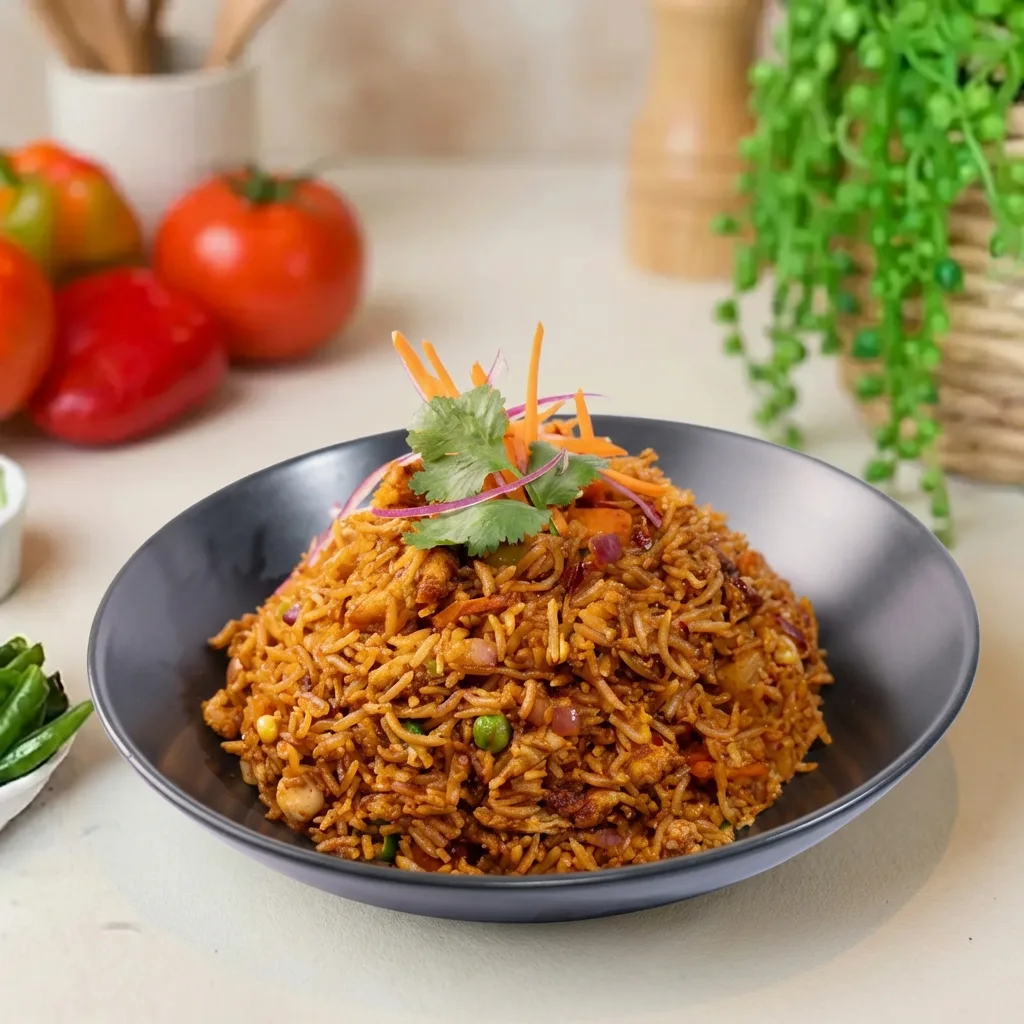 Nepalese style stirs rice sautéed with eggs, onion, garlic, soya sauce, chilli and finished with Nepalese spices